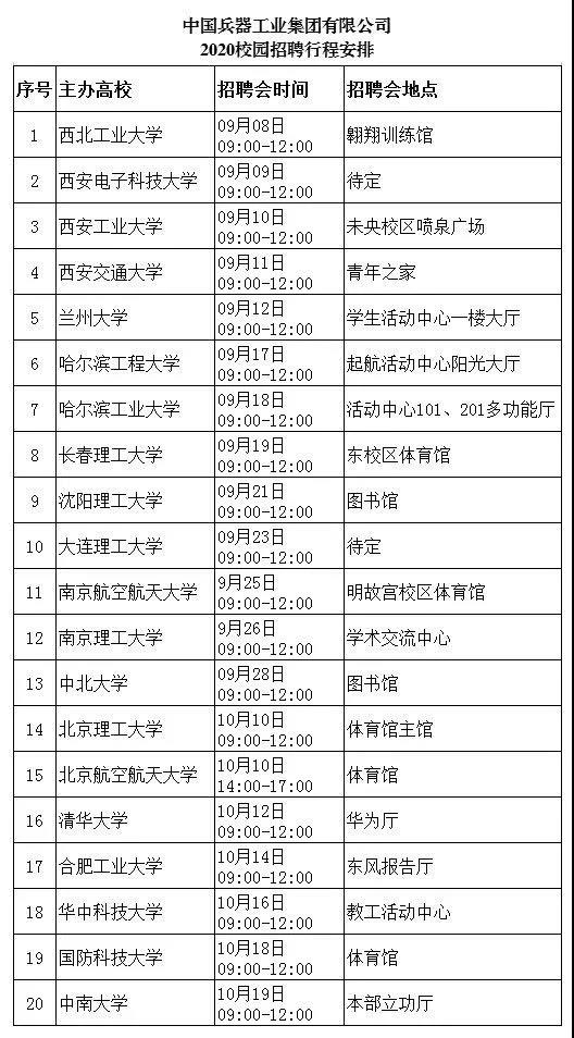 中國兵器工業集團 2020校園招聘火熱來襲 只等你來哦 有夢想的青年,請往下面看 讓我們攜手強軍報國 公司簡介 我們是我軍機械化、信息化、智能化裝備發展的骨干 我們是全軍毀傷打擊的核心支撐 我們是現代化新型陸軍體系作戰能力科研制造的主體 我們是國家“一帶一路”建設和軍民融合發展的主力 我們就是 中國兵器工業集團 我們闊步邁進世界一流防務集團 資產總額3960億元 世界500強企業排名140 中國制造業企業排名第9 連續15年獲國資委經營業績考核A級 招聘信息 面對2020年離開校園的你們,我們準備了 >>職位:1500余個 >>招聘人數:3774人 >>專業涉及: 武器類 武器系統與發射工程,彈藥工程與爆炸技術,探測制導與控制技術等 機械類 機械設計制造及其自動化,車輛工程,工程力學,機械電子工程等 電子類 電氣工程及其自動化,電子信息工程,通信工程,儀器儀表工程等 材料類 金屬材料工程,材料成型及控制工程,高分子材料與工程,材料科學與工程等 計算機類 計算機科學與技術,計算機系統結構,計算機軟件與理論,網絡工程等 經管類 財務管理,工商管理,行政管理,人力資源管理,會計學,審計學等 其他 環境與安全類,臨床醫學,語言類,建筑學,法學,采礦工程,化學類等 行程安排 中國兵器工業集團2020屆校園招聘會將在全國12個城市、20所高校舉辦,招聘會具體行程見下表: